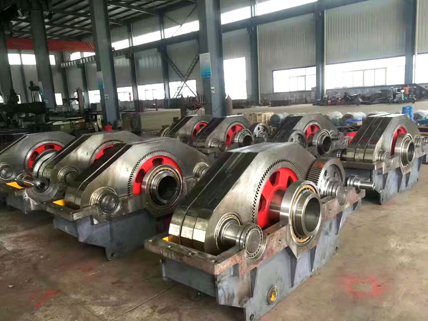 三環(huán)減速機傳動,采用行星齒輪內(nèi)嚙合方式傳遞動力。根據(jù)火車頭采用的“四桿機構”的原理,同步旋轉(zhuǎn)二根曲軸,帶動相互平行的、嵌有內(nèi)齒輪的三只環(huán)片,在空間作平面圓周運動,內(nèi)齒輪都圍繞一只輸出軸齒輪旋轉(zhuǎn),呈現(xiàn)“多層齒圈”圍繞一個中心輪、作行星式“流轉(zhuǎn)嚙合”的布局。