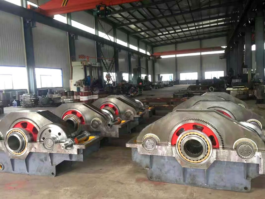 三環(huán)減速機傳動,采用行星齒輪內(nèi)嚙合方式傳遞動力。根據(jù)火車頭采用的“四桿機構”的原理,同步旋轉(zhuǎn)二根曲軸,帶動相互平行的、嵌有內(nèi)齒輪的三只環(huán)片,在空間作平面圓周運動,內(nèi)齒輪都圍繞一只輸出軸齒輪旋轉(zhuǎn),呈現(xiàn)“多層齒圈”圍繞一個中心輪、作行星式“流轉(zhuǎn)嚙合”的布局。